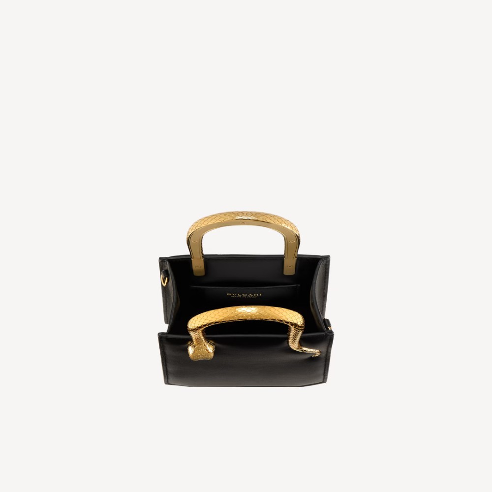 Combining a very structured vertical body with jewellery-inspired details evoking the serpent’s sinuous movements, the Serpentine mini tote bag is crafted in resistant yet soft black Metropolitan calf leather. Featuring two snake body-shaped handles embellished with engraved scales and red enamel eyes, whose design draws inspiration from the bold Serpenti heritage necklaces of the 1960s, this on-trend bag is completed by a single open compartment, a leather strap and an internal patch pocket. 13 x 17.5 x 5.5 cm – 5.1 x 6.9 x 2.2″. Made in Italy.