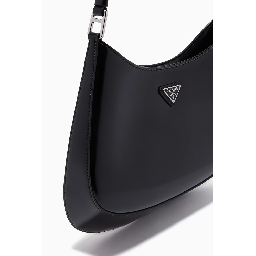 The Prada Cleo bag with sophisticated allure reinterprets an iconic design of the brand from the 1990’s. Sleek curved lines emphasized by the particular construction rounded on the bottom and sides give this hobo bag a soft, light look. Brushed leather, a modern and versatile material that is distinctive in Prada collections, is ideal for creating always new combinations and contrasts. The enamel triangle logo decorates the silhouette.