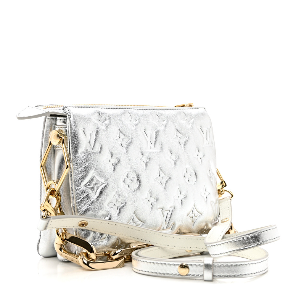 The epitome of luxury and elegance in the form of the Louis Vuitton Coussin BB Silver – a masterpiece designed for those who appreciate the finer things in life. This exquisite handbag blends the timeless allure of Louis Vuitton with contemporary flair, offering an accessory that is not just a statement piece but a work of art.